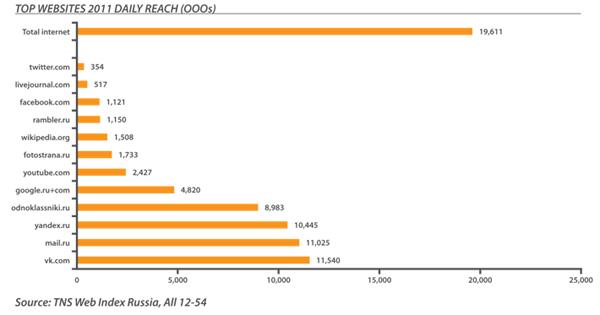Facebook и Google пока не настолько популярны у россиян, как Вконтакте и Одноклассники. У Твиттера на данный момент около 4 млн пользователей, но ежедневный охват низок, а рост ограничен низким проникновением смартфонов и планшетов. Крупнейшей поисковой системой остаётся Яндекс. Однако популярность Google растет, особенно у молодежи. Крупнейшей почтовой системой является Mail.ru – самая старая по времени возникновения система, чем, во многом, и обусловлен ее успех.