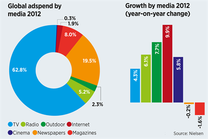 Согласно последнему отчету Global AdView Pulse, проведенному Nielsen, телевидение продолжает лидировать в этой сфере. В 2012 году расходы на телерекламу составили 62,8% от всех трат, показав рост на 4,3% в сравнении с 2011 годом. Единственным сектором, в котором рекламные расходы снизились, стала пресса.