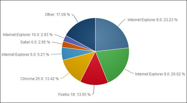 Самая распространённая версия веб-обозревателя компании Microsoft — Internet Explorer 8, у которой 23,23%. Доля Internet Explorer 9 в прошлом месяце равнялась 20,62%. Браузер Internet Explorer 10, начав месяц с 1,58%, закончил его с долей в 2,93%, что объясняется прежде всего выходом версии продукта для операционной системы Windows 7.