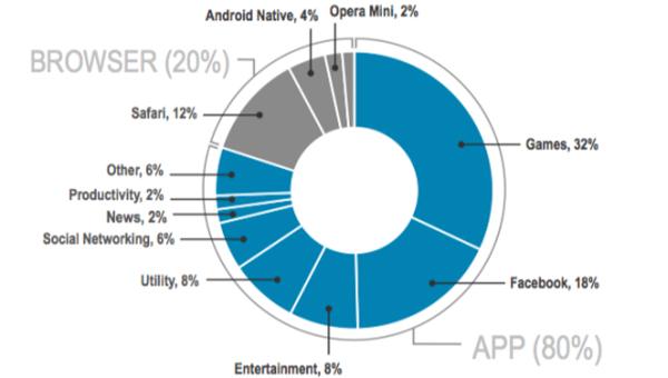 80% времени, в течение которого американцы используют мобильные устройства, пользователи проводят в компании мобильных приложений: игр, новостей, социальных сетей и других полезных программ – и только 20% времени остается на мобильный веб: браузеры Safari, Android Native и Opera Mini. В течение каждого дня владельцы смартфонов и планшетов тратят 2 часа и 7 минут на приложения и всего 31 минуту на серфинг через браузеры.