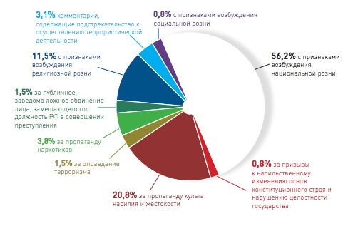 Большая часть из них касается возбуждения национальной и религиозной розни, пропаганды насилия и жестокости, подстрекательства к терроризму и публичного обвинения госслужащего в преступлениях.