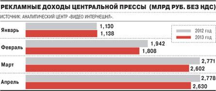 Рекламные доходы центральной прессы в минувшем апреле снизились на 5,3%, до 2,63 млрд руб. без НДС, подсчитал АЦВИ на основе данных TNS Russia. При этом если у газет и журналов, лидирующих в своих нишах, ситуация стабилизировалась, то показатели относительно мелких изданий резко ухудшились, у многих из которых падение доходов составило уже 20-50% и более, что дает повод ожидать их массового закрытия в течение года, отмечает эксперт АЦВИ Александр Ефремов.