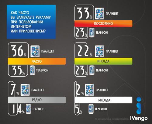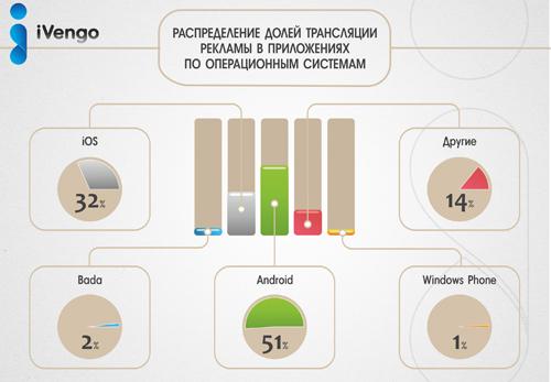 Мобильная реклама в приложениях становится оптимальным инструментом для общения с аудиторией. На сегодняшний день 42% пользователей мобильного интернета ежедневно заходят в Сеть со своего смартфона. Лишь 2% опрошенных ответили, что ни разу не воспользовались мобильным интернетом за последнюю неделю . Рекламодателям стоит обратить внимание и на отсутствие эффекта раздражительности у пользователей, в отличие от стандартных рекламных форматов. В особенности это касается full-screen баннеров, т.к. они не мешают пользователю работать с приложением, а отображаются лишь во время его загрузки, что, несомненно, повышает лояльность к рекламному объявлению. По результатам исследования J’son & Partners Consulting и Айвенго Мобайл подавляющее большинство пользователей смартфонов и планшетных компьютеров обращают внимание на размещенную в мобильных приложениях рекламу, тем более реклама в большинстве своем полезна для пользователя при правильно выбранном таргетинге. При этом владельцы популярных приложений предпочитают отдавать трафик мобильным сетям, а не заниматься продажей рекламы самостоятельно. Среди российских игроков рынка можно выделить DSP-платформу iVengo Mobile, код которой встроен в сотни известных мобильных приложений из разных категорий по всему миру. Не смотря на то, что сама компания вышла на рынок не так давно, ей уже принадлежат права на эксклюзивное размещение различных форматов мобильной рекламы в известных деловых СМИ, среди которых новости федерального телеканала 'Вести', 'Спортбокс', 'Аргументы и Факты', 'Сплетник' и др. А среди клиентов известные международные бренды, такие как Volvo, P&G, Bridgestone, Red Bull, МТС, Skoda и др.
