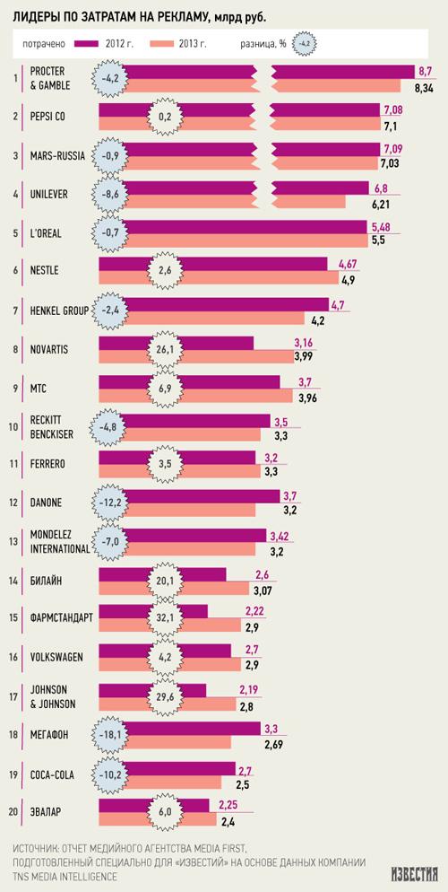 Лидеры рынка урезали свои рекламные бюджеты в 2013 году. По данным отчета медийного агентства Media First, подготовленного специально для «Известий» на основе данных компании TNS Media Intelligence, в минувшем году значительно снизили свои траты на рекламу «МегаФон», «Ростелеком», Сбербанк России, Unilever, Procter&Gamble, Coca-Cola, Danone, Mareven Food Central (марки «Роллтон», Big Bon и другие), Nestle, «Эльдорадо» и другие компании. Зато не пожалели средств на рекламу производители и дистрибуторы лекарственных средств и БАДов.
