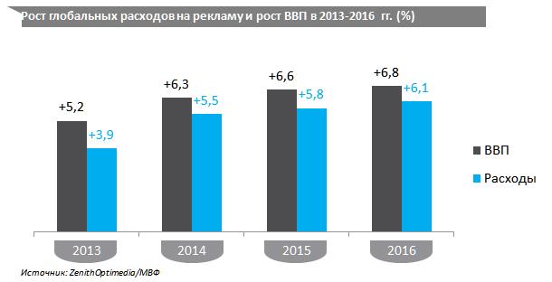 Международная коммуникационная сеть ZenithOptimedia опубликовала новый прогноз развития рекламного рынка. Согласно прогнозу, глобальные расходы на рекламу по итогам этого года вырастут на 5,5% и достигнут $532 млрд. В предыдущем прогнозе сети, выпущенном в декабре 2013 г., рост рекламных инвестиций в 2014 году ожидался +5,3%. В 2015 году глобальный рынок вырастет на 5,8%., а в 2016 г. – на 6,1%, прогнозирует ZenithOptimedia. Позитивные изменения обусловлены восстановлением мировой экономики и бурным развитием мобильных технологий, которые открывают новые возможности для медиапотребления. Росту мирового рынка также будут способствовать стабилизация экономической ситуации в еврозоне и такие события, как зимняя Олимпиада в Сочи, Чемпионат мира по футболу и промежуточные выборы в США.