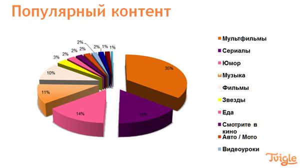 Любопытные данные по контенту на Smart TV представил директор по интернет-маркетингу Tvigle Media Виктор Костенко. Самый популярный контент – это мультфильмы (35%), далее идут сериалы (15%), и тройку лучших закрывают, как ни странно, юмористические передачи (14%).