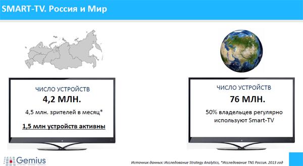 Первое полномасштабное исследование аудитории Smart TV в России, которое провели Gemius совместно с Tvigle Media, представил глава представительства Gemius в России Антон Мелехов. Число устройств Smart TV в России оказалось равно 4,2 млн, 1,5 млн из которых активны. Кроме того, в нашей стране насчитывается 4,5 млн зрителей в месяц. Для сравнения, в мире – 76 млн устройств Smart TV, 50% владельцев которых регулярно их используют.