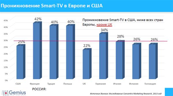 Любопытно, что по проникновению Smart TV США показывает результат ниже всех стран Европы, кроме UK (25% и 22% соответственно). Во Франции проникновение составляет 42%. По России данных пока нет, но, по отметке Антона Мелехова, проникновение – около 30%.