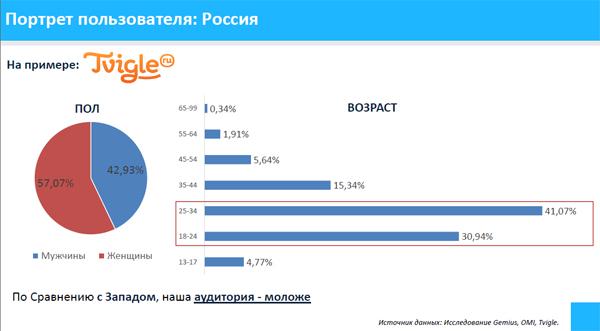 Отметим, что, по сравнению с Западом, российская аудитория Smart TV значительно моложе. Пользователи в возрасте 25-34 лет составляют 41,07% всей аудитории. Преобладают женщины (57,07%), основная доминанта – люди со средним и выше среднего доходом.