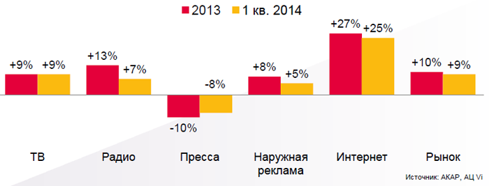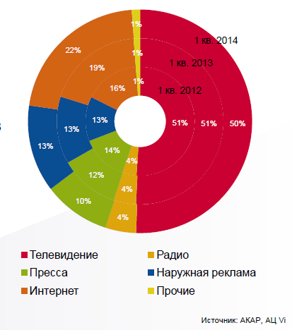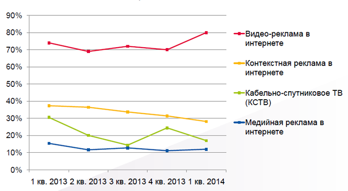 Что касается динамики наиболее быстро растущих подсегментов рекламного рынка в первом квартале 2014 года, то здесь видеореклама опережает всех по темпам роста (около 80%), следом идут контекстная реклама в интернете (около 29%), кабельно-спутниковое ТВ (около 18%) и медийная реклама в интернете (около 12%).