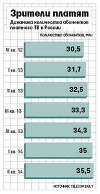 В апреле — июне 2014 г. количество пользователей платного ТВ в России увеличилось примерно на 500 000 до 35,5 млн, следует из отчета Telecom Daily. Ежеквартальный рост оказался примерно на 30% меньше, чем в предыдущие два квартала, говорится в нем. По данным Telecom Daily, в 2013 г. база пользователей платного ТВ росла от квартала к кварталу на 0,7-1,2 млн. При этом прирост на 0,5 млн подписчиков минимальный на российском рынке платного ТВ за последние три года, уверен гендиректор Telecom Daily Денис Кусков.