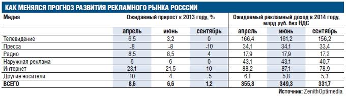 Агентство ZenithOptimedia подготовило очередной прогноз развития рекламного рынка, кардинально пересмотрев свои оценки. Еще в апреле оно полагало, что затраты на рекламу в России увеличатся в 2014 году на 8,6%, до 355,8 млрд руб. без НДС. В июне речь шла уже о 6,6%, до 349,3 млрд руб. Теперь аналитики ZenithOptimedia рассчитывают лишь на 1,2%, до 331,7 млрд руб. По итогам всего года положительную динамику продемонстрируют только два медиа – радио и интернет.