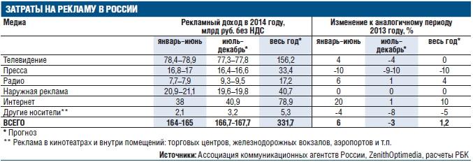 В своих прогнозах ZenithOptimedia базируется в том числе на ранее озвученных оценках Ассоциации коммуникационных агентств России (АКАР). По ее версии, в первом полугодии весь рекламный рынок вырос на 6%, до 164–165 млрд руб. Тогда сокращение доходов было зафиксировано лишь в трех сегментах – прессе, кинотеатрах и indoor (реклама внутри помещений), а наружная реклама показала нулевой прирост.