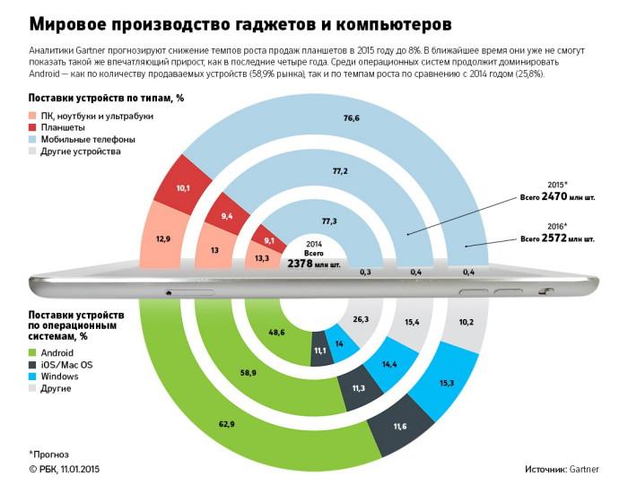 В 2015 году мировые продажи планшетов достигнут 233 млн устройств – это всего на 8% больше, чем в 2014 году, прогнозируют аналитики исследовательской компании Gartner. По их мнению, рынок планшетов уже не вернется к высоким темпам роста, которые он сохранял последние четыре года. На рынке операционных систем Windows будет расти быстрее, чем iOS от Apple, но главенствующую роль продолжит играть Android