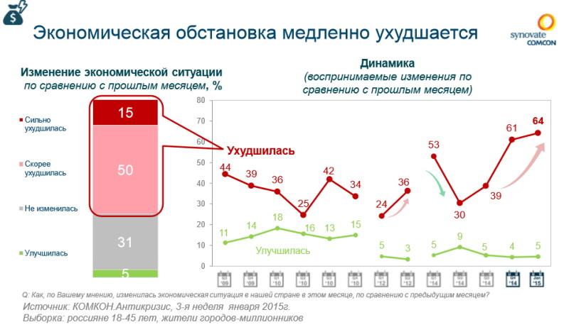 По сравнению с четвертым кварталом 2014 года россияне чуть чаще стали говорить об ухудшении экономической ситуации в стране. По итогам последнего замера 64% экономически активных жителей городов-миллионников считают, что ситуация ухудшилась, в то время как треть опрошенных (31%) утверждает, что по сравнению с прошлым месяцем не ощутили никаких изменений.