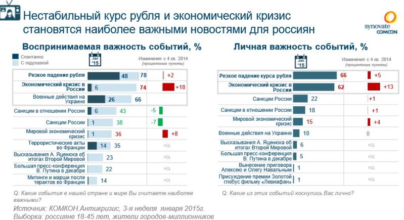 Нестабильность курса рубля остается главным событием для экономически активного населения крупных городов России. Влияние курса на себе уже ощутили 66%. Военные действия на Украине сохранили тот же уровень актуальности, что и в конце прошлого года (эта тема по-прежнему беспокоит 66% опрошенных), однако, в январе 2015, года по важности ее опередил экономический кризис. Сейчас новости об экономической ситуации в России считают важными 74% опрошенных (+18 пп.), при этом 62% респондентов отметили, что кризис коснулся их лично. Важность санкций и антисанкций России постепенно убывает – эти новости беспокоят россиян все меньше (-5–7 пп. по сравнению с четвертым кварталом 2014 года), при этом респонденты стали чаще говорить о мировом экономическом кризисе (согласно данным первого январского опроса 36% считают эту тему важной).