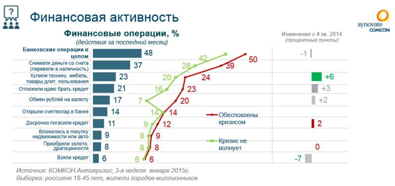 Группа обеспокоенных кризисом была более активна в совершении банковских операций: так, среди них 20% обменяли рубли на валюту (против 7% необеспокоенных), также 39% поспешили снять деньги со счетов в банках или закрыть вклады, переведя сбережения в наличность.