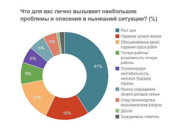 Рост цен и снижение уровня жизни привели к тому, что все большее количество россиян осознает глубину экономических проблем России, показывает опрос «Левада-центра». Если в январе 2014 года на вопрос, «что, по-вашему мнению, сейчас более всего угрожает России», о кризисе говорило менее трети опрошенных, то в январе 2015-го – уже каждый второй
