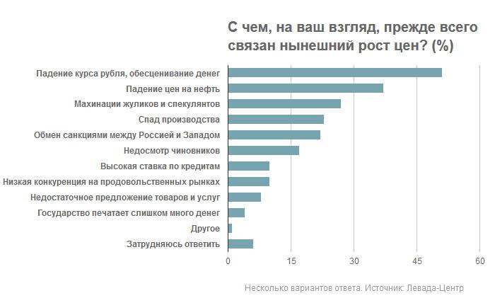 Самой значимой угрозой для России россияне считают рост цен и обнищание широких слоев населения (54%, +5 п.п. к уровню января 2014 года), показывает проведенное в конце января исследование «Левада-центра» по вопросам, предложенным РБК. Основными причинами роста цен россияне называют падение курса рубля и обесценивание денег (51%), снижение цен на нефть (37%) и махинации жуликов и спекулянтов (27%).