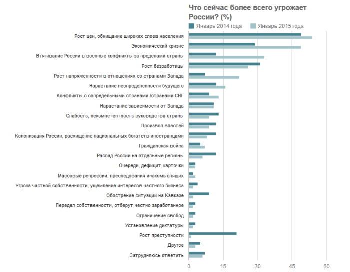 Наиболее возросшими за год в глазах общественного мнения угрозами стали экономический кризис, втягивание России в военные конфликты и обострение противоречий с Западом. Если в январе 2014 года на вопрос, «что, по-вашему мнению, сейчас более всего угрожает России», о кризисе говорило менее трети опрошенных (29%), то в январе 2015-го – уже каждый второй (49%). Хотя пикового значения за последнюю историю наблюдений этот ответ пока не достиг (59% – в январе 2009 года).