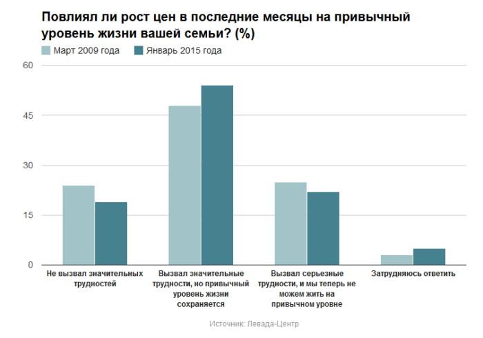 Рост цен повлиял на привычный уровень жизни большинства россиян: о том, что инфляция не вызвала значительных трудностей, социологам заявили только 19% опрошенных (в разгар предыдущего кризиса, в марте 2009 года, рост цен не вызвал трудности у большего числа ответивших – 24%). Из тех, кто говорит о проблемах, вызванных ростом цен, большинство пока сумели сохранить привычный образ жизни (54%), в то же время 22% россиян уже не могут обеспечить себе прежний уровень.