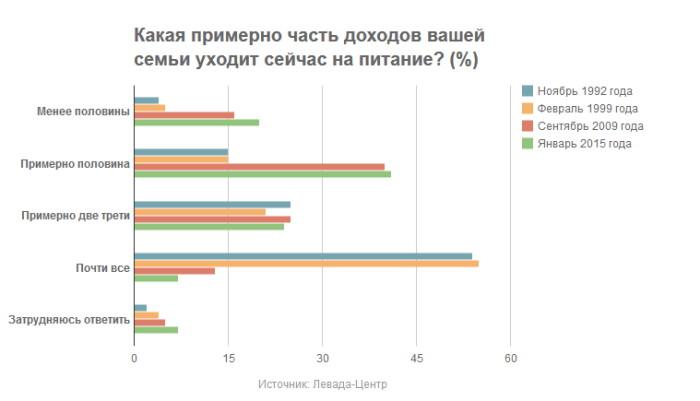 По оценке большинства опрошенных, цены за прошедший год выросли более, чем на 15% (официальная инфляция за 2014 года, по данным Росстата, – 11,4%). Более половины россиян заявили социологам, что товары и услуги, которые приобретают их семьи, подорожали в пределах 15-50%, еще почти четверть опрошенных убеждены, что цены в среднем выросли на 50-100%. О подорожании в пределах менее чем 15% говорит лишь каждый одиннадцатый опрошенный (9%).