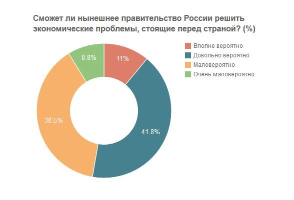 Почти половина опрошенных считают, что нынешнее правительство России сможет решить экономические проблемы: 10% ответили, что это вполне вероятно, 38% – довольно вероятно, 35% – это маловероятно, 8% – очень маловероятно; еще 10% затруднились ответить. Довольно высокий уровень уверенности в правительстве обусловлен как отголосками надежд, которые россияне испытывают по отношению к властям в связи с ситуацией на Украине, так и тем, что в кризисной ситуации люди осознают свою беспомощность перед неконтролируемыми внешними обстоятельствами, считает Красильникова.