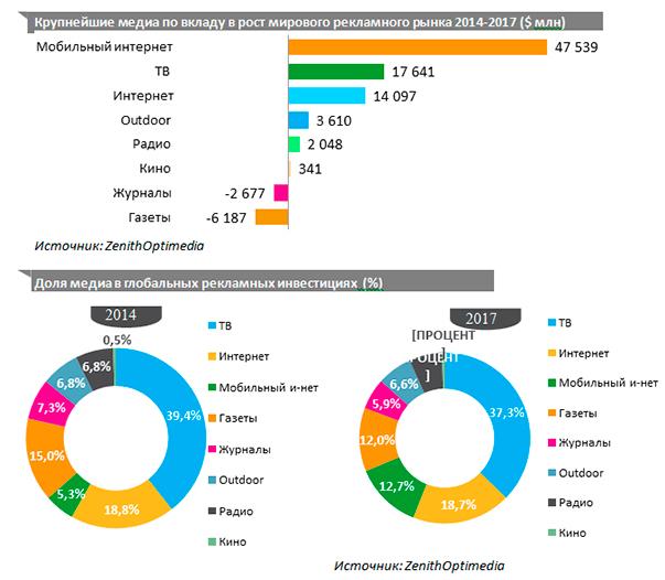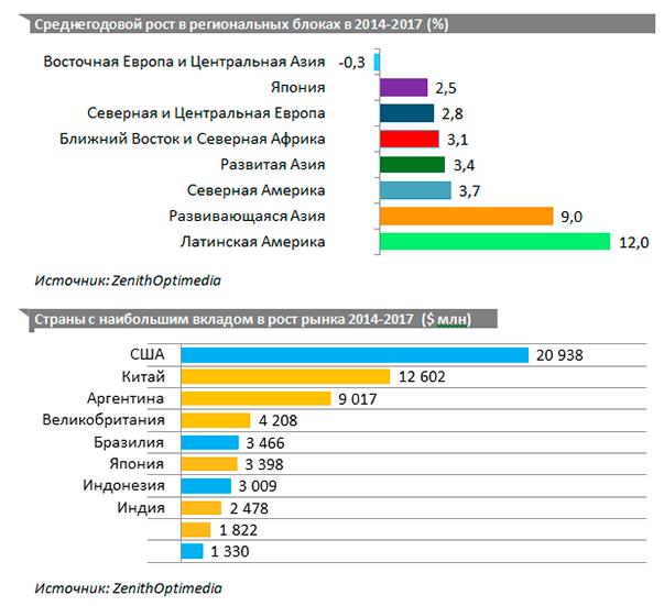 Международная коммуникационная сеть ZenithOptimedia опубликовала новый прогноз развития рекламного рынка. Согласно прогнозу, глобальные расходы на рекламу по итогам этого года вырастут на 4,4%. В предыдущем прогнозе сети, выпущенном в декабре 2014 г., рост рекламных инвестиций в 2015 году ожидался на уровне +4,9%. Причинами снижения прогноза являются экономическая нестабильность в России и Украине, а также падение динамики роста в Китае. В 2016 году, под влиянием летних Олимпийских игр и выборов президента в США, рост глобального рынка увеличится до 5,3%. В 2017 г. мировую рекламу ожидает рост на 4,8%, прогнозирует ZenithOptimedia.