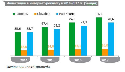 Самой динамично развивающейся рекламной категорией является онлайн-видео. Ее рост обусловлен ростом количества мобильных устройств и бурным развитием сегмента мобильного видео. В период с 2015 по 2017 гг. онлайн-видео будет расти в среднем на 29% в год. К 2017 году объем этого рынка достигнет $23,3 млрд. «Онлайн-видео сочетает в себе эмоциональную вовлеченность, которую обеспечивает телевидение с возможностями тагретинга и измеримостью цифровых медиа. Несмотря на то, что телевидение остается лидером мирового рекламного рынка по объему инвестиций, рекламодатели все чаще используют онлайн-видео в дополнение к ТВ-рекламе и как самостоятельный канал», - говорит Стив Кинг, CEO ZenithOptimedia Worldwide.
