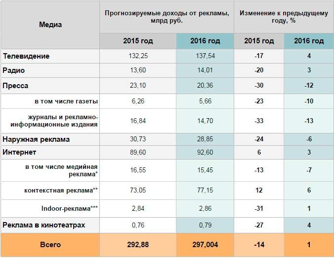 В 2015 году общие расходы на рекламу, по версии Group M, уменьшатся на 14%, до 292,9 млрд руб. без НДС. Отрицательную динамику продемонстрируют все медиасегменты, кроме интернета, доходы которого вырастут только благодаря контекстной рекламе (коммерческие ссылки в результатах поиска и на профильных ресурсах). В январе—июне, по оценке АКАР, объем рекламного рынка снизился на 16%, до 137,4–137,9 млрд руб. Положительную динамику продемонстрировала все та же контекстная интернет-реклама — рост на 15%, до 34,5–34,8 млрд руб.