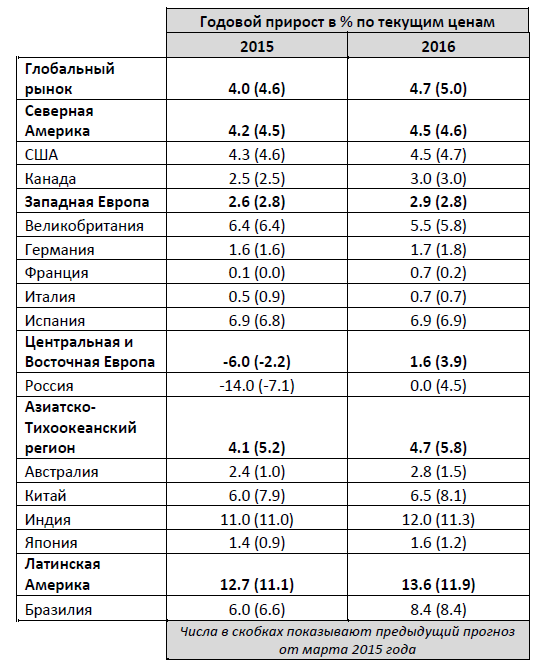 Основываясь на данных, собранных на 59 рынках Северной и Южной Америки, Азиатско-Тихоокеанского региона (АТР), а также Европы, Ближнего Востока и Африки, Carat прогнозирует рост глобальных расходов на рекламу по итогам 2015 года на 4,0%, до $529 млрд. Эта оценка несколько ниже, чем предполагалось в мартовском прогнозе (+4,6%), а рост глобального рекламного рынка в 2016 году ожидается на уровне 4,7%, на $25 млрд. Прогноз на 2016 сократился на 0,3%. Ключевым фактором, определяющим снижение темпов роста расходов на рекламу, является экономическая и политическая нестабильность в Китае и России и как следствие сокращение рекламных инвестиций.