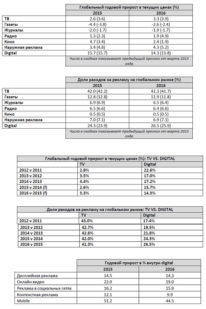 В целом по миру digital продолжает быть единственным медиа, показывающим двукратный рост: согласно прогнозу, доля рекламных инвестиций в digital увеличится на 15,7% в 2015 году и на 14,3% в 2016 году. Это обусловлено высоким спросом на мобильную интернет-рекламу и онлайн-видео, особенно в социальных сетях – в этом году ожидается прирост на 51,2% и 22% соответственно. В целом рост расходов на мобильную рекламу – самый высокий среди других медиа, годовой прирост в 2016 году составит 44,5%.