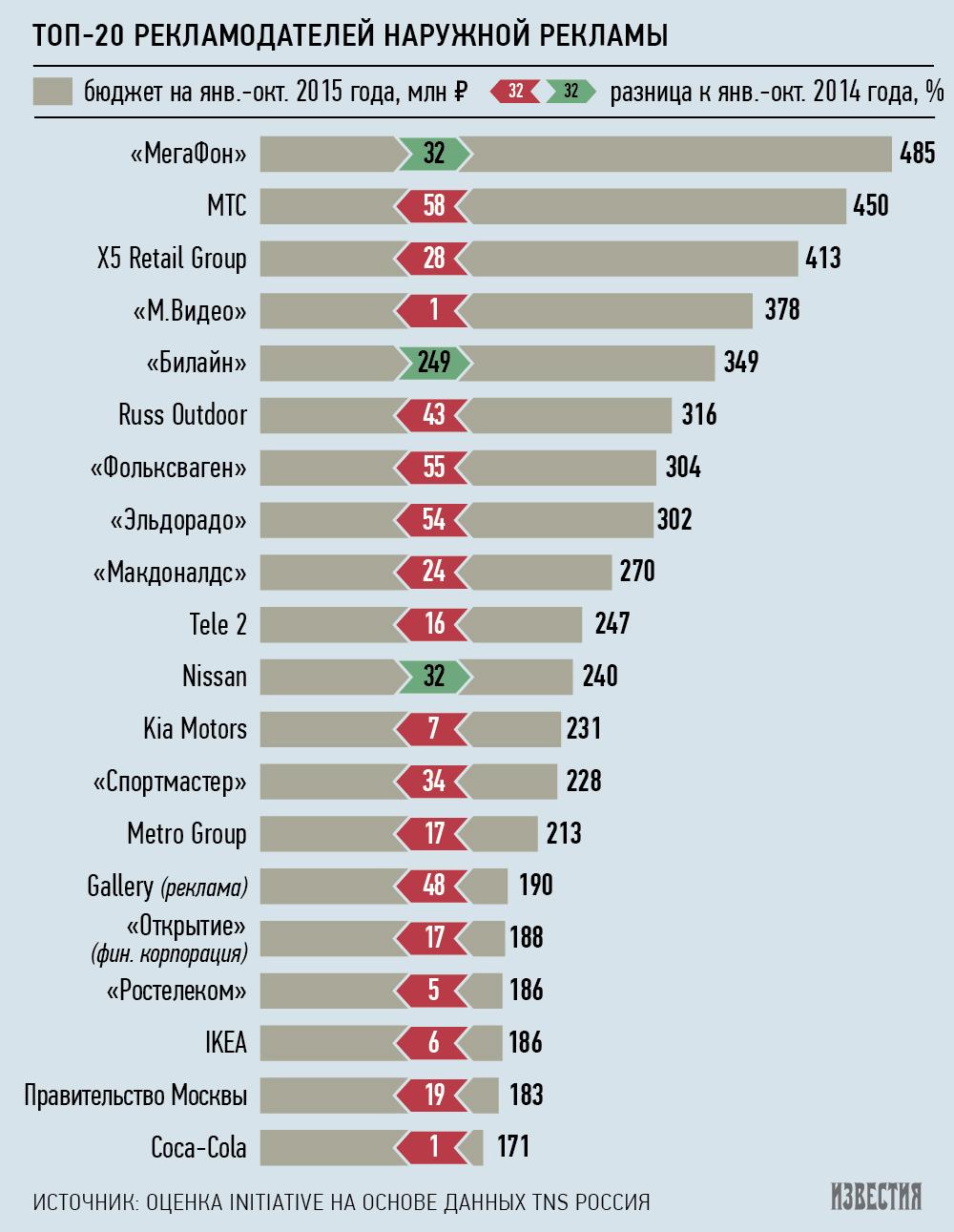 По сравнению с 2014 годом больше чем наполовину сократили свой бюджет на наружную рекламу правительство Москвы (183 млн рублей), «Спортмастер» (228 млн рублей), Metro Group (213 млн рублей) и крупнейший оператор наружной рекламы Russ Outdoor (316 млн рублей). На треть меньше в 2015 году на свою рекламу на уличных объектах потратила сеть магазинов «Эльдорадо».