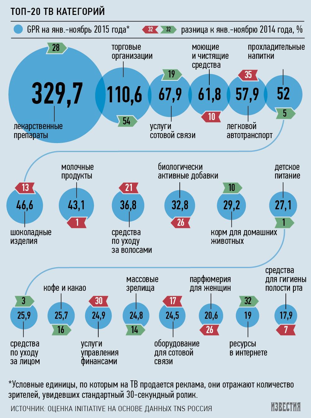 На телеэкранах стало больше рекламы лекарственных препаратов — фармацевтические компании в 2015 году увеличили объем рекламы на 28%, таким образом став самым крупным рекламодателем на ТВ по итогам января–ноября 2015 года. Об этом говорится в отчете агентства Initiative на основании статистики TNS, с которым ознакомились «Известия». При этом на радиорекламу существенно увеличили затраты автомобильные компании: General Motors — на 139%, BMW — на 60%, Nissan — на 13% по сравнению с аналогичным периодом прошлого года. В наружной рекламе, напротив, наблюдается спад — топ-20 рекламодателей сократили затраты на 30%.