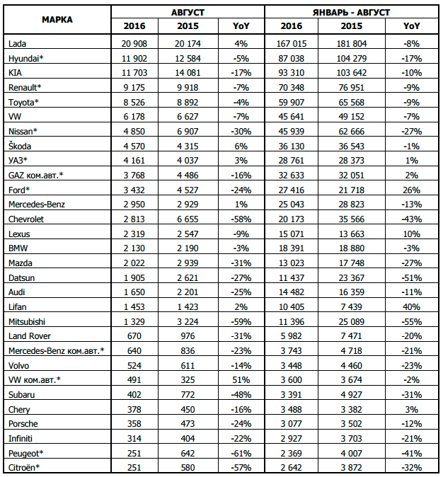 Продажи новых легковых и легких коммерческих автомобилей в России по маркам за периоды август 2016/2015 гг. и январь-август 2016/2015 гг.