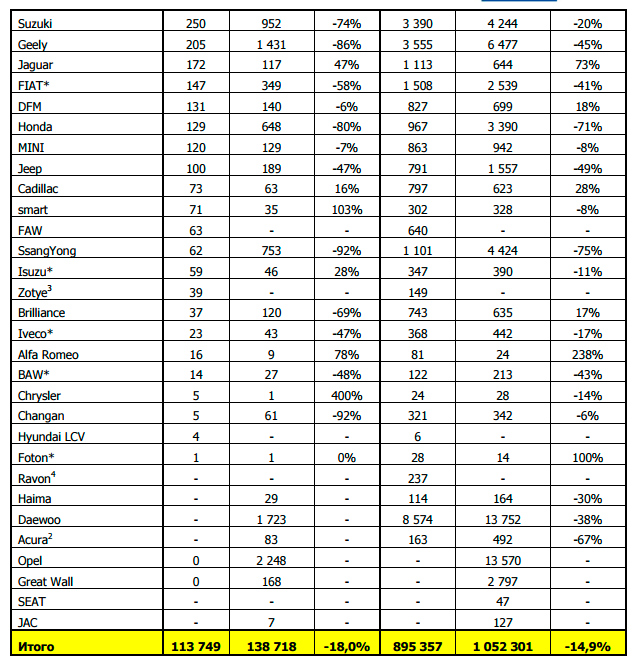 1. Продажи легких коммерческих автомобилей включены в общие цифры продаж по маркам, если присутствуют в продуктовой линейке марки (отмечены *); указаны отдельно по некоторым маркам. LCV<3,5т (в отдельных исключениях масса достигает верхнего предела 6т). Возможны незначительные корректировки данных по легкой коммерческой технике. 2. Продажи марки Acura были временно приостановлены в июне 2016 г. 3. Продажи марки Zotye в России начались в марте 2016 г. 4. Продажи по марке Daewoo были остановлены в июне 2016г. 5. Продажи бренда Ravon начались в июле 2016 г. Обмен данными по бренду Ravon приостановлен с августа 2016 г.
