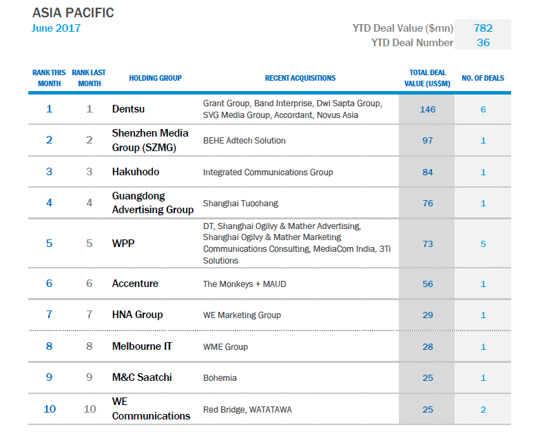 В Азиатско-Тихоокеанском регионе лидерами по объемам сделок в первой половине 2017 г. стали рекламный холдинг Dentsu и медиакомпания Shenzhen Media Group.