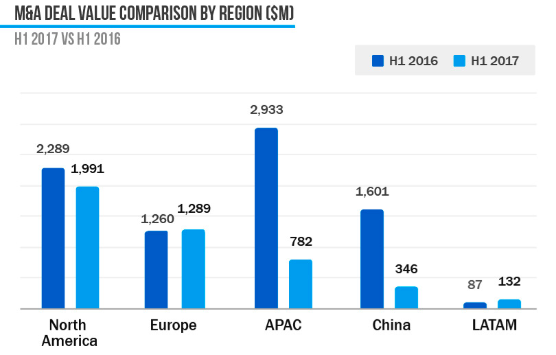 За первое полугодие 2017 года на мировом рынке M&A было проведено 184 сделки на общую сумму $4,1 млрд. Это на 10% меньше по количеству и на 39% — по объему, чем за аналогичный период 2016 года, согласно данным исследовательской компании R3