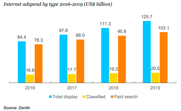 Дисплейная реклама остается самой быстрорастущей категорией в интернете — ежегодный рост составит 14%. Ожидается, что к 2019 г. доля дисплея достигнет 50,4% и составит $126 млрд. Движущей силой станут социальные сети и онлайн-видео с ежегодным ростом 20% и 21% соответственно.