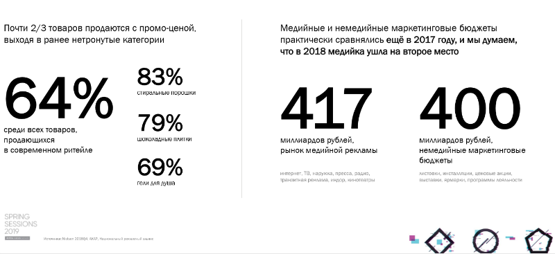 Неуверенность потребителя стимулирует развитие промоакций, считают в DAN. Почти 2/3 товаров продаются с промоценой, говорит Мария Донских. Медийные и немедийные маркетинговые бюджеты почти сравнялись еще в 2017 г. (417 млрд руб. и 400 млрд руб. соответственно), а в прошлом году медийная реклама ушла на второе место, отмечает эксперт.