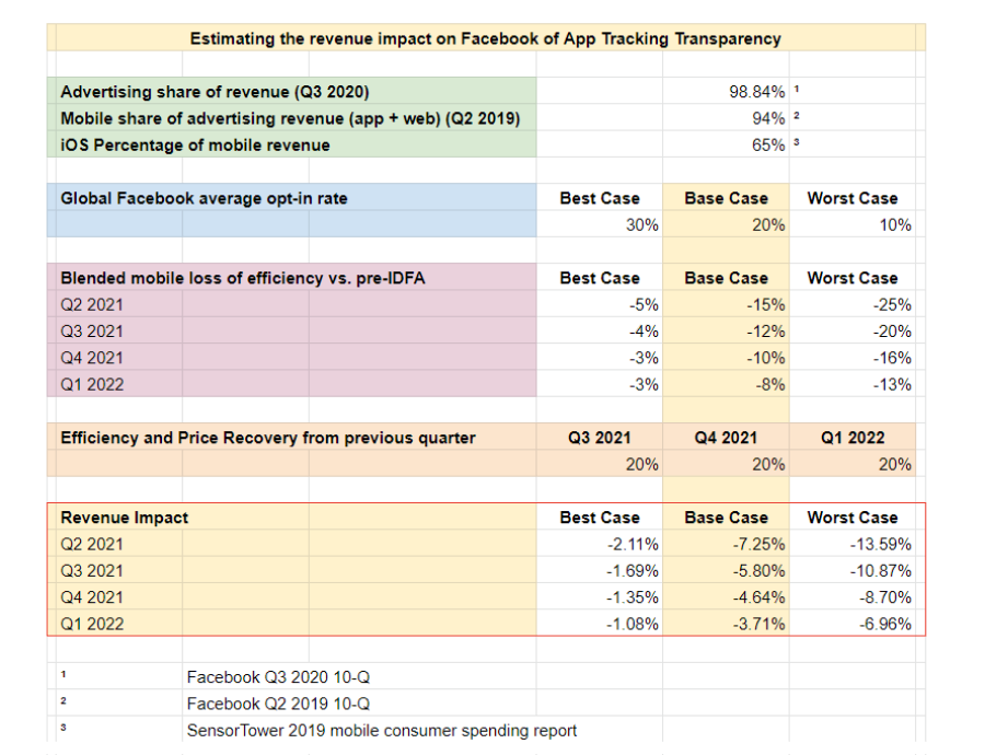 Его расчет основан на данных о доле iOS-устройств в выручке Facebook отпродажи мобильной рекламы, на информации о доле пользователей, давших согласиена сбор данных (opt-in rate), а также на сведениях об эффективности рекламы идинамике цен.