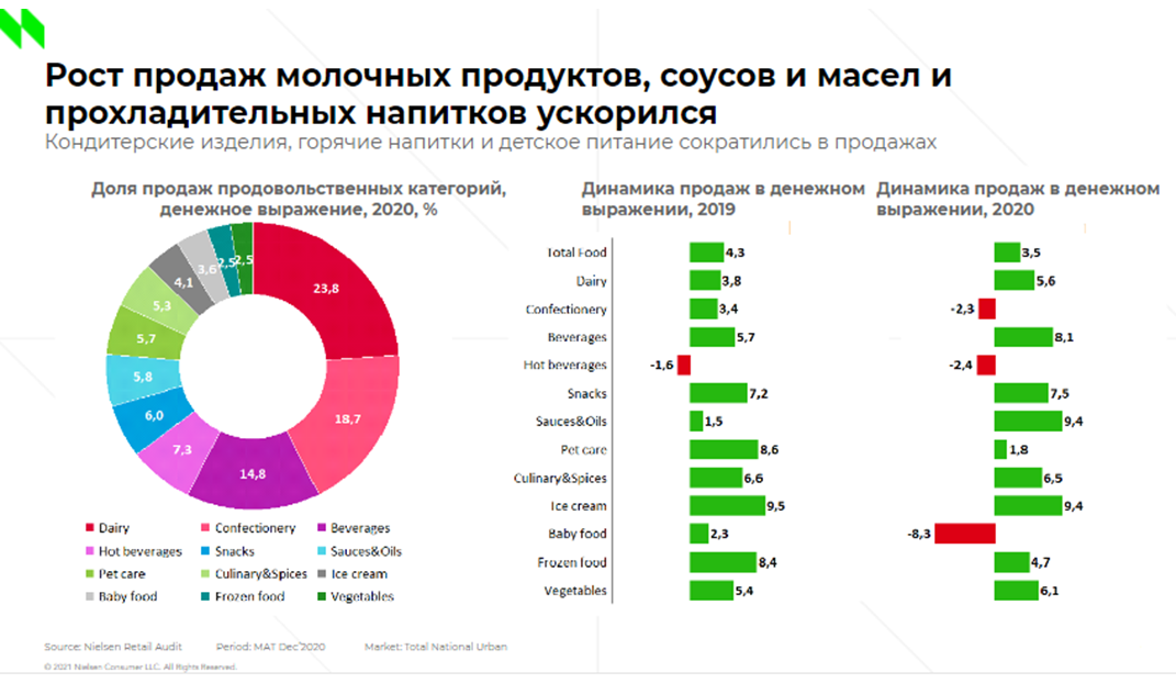 Продовольственные категории выросли на 3,5 после 4,3% годом ранее, сегментнепродовольственных товаров показал снижение на 3% (на фоне роста на 2,2% в2019-м).