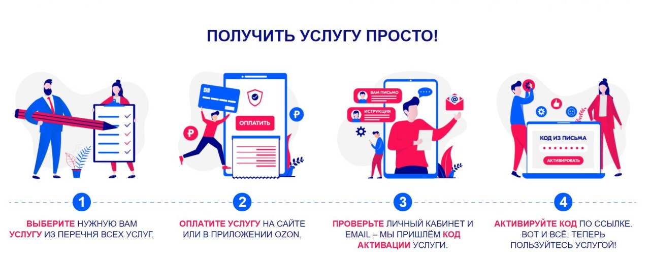 Оформив и оплатив заказ, покупатель получит письмо с кодом активации иинструкцией по использованию услуги. Со своей стороны Ozon гарантирует проверкукаждого исполнителя и возврат средств в случае, если потребителя не устроилокачество оказанной услуги. Невыполнение условий договора грозит партнеру вечнойблокировкой.