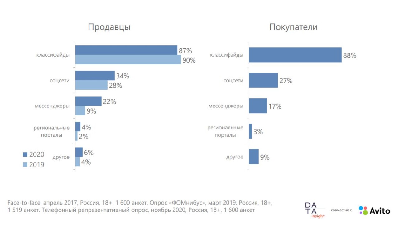 На стороне покупателей аналогичный расклад: они выбирают классифайды (88%),соцсети (27%) и мессенджеры (17%).