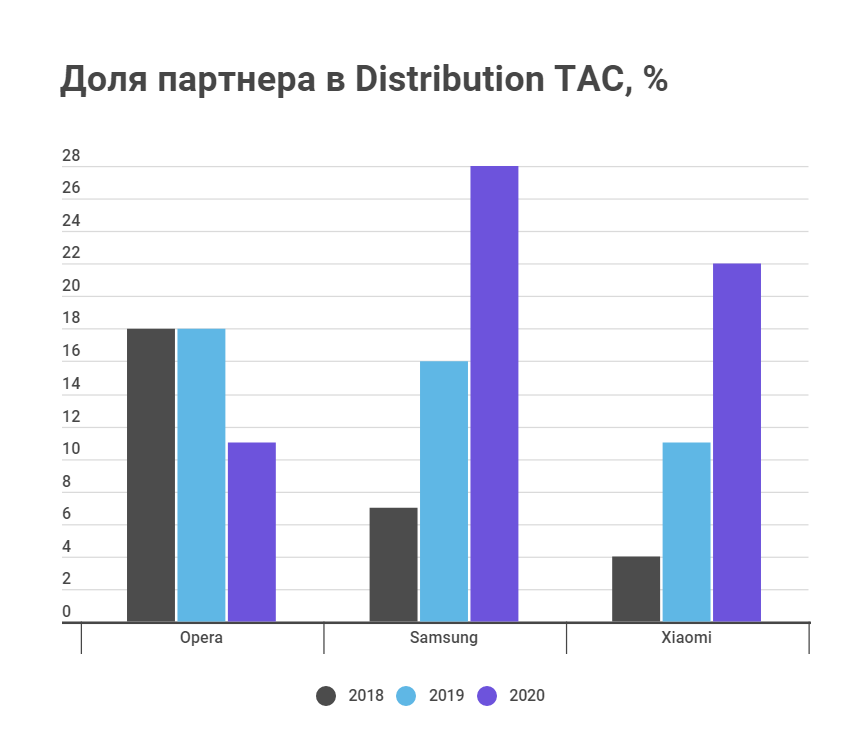 Из отчетности следует, что с 2012 по 2019 г. главным дистрибьютором«Яндекса» была компания Opera, но год назад ее доля упала с 18 до 11%, алидером стал Samsung. Производитель электроники последовательно укреплял своипозиции: если в 2018 г. на него приходилось 7% от Distribution TAC, а в 2019-м— 16%, то в 2020-м доля достигла 28%. Аналогичным образом наращивала долюкомпания Xiaomi, с 4 до 11 и до 22%. Исходя из цифр, опубликованных «Яндексом»,ежегодные выплаты Samsung можно оценить примерно в 2 млрд руб.