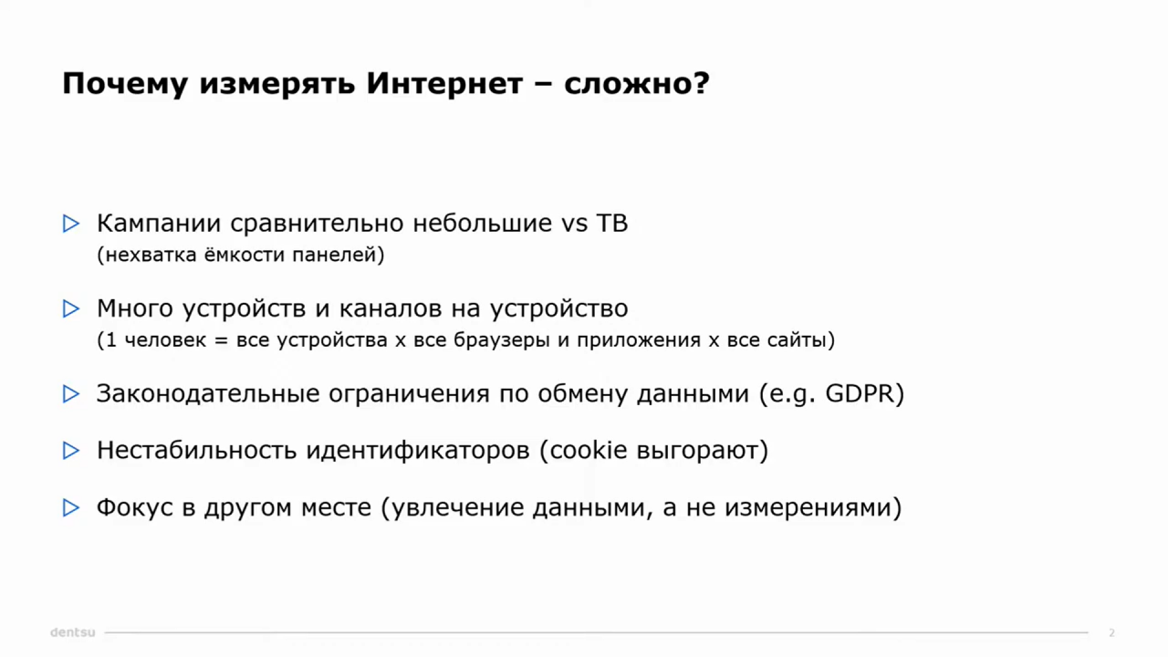 В свою очередь, Лев Глейзер напомнил о монопольномположении исследовательских компаний на основных рынках. По его словам,рекламному рынку не нужно две разных валюты, а кросс-медийный подход позволяетпосмотреть на измерения не с точки зрения статистики площадок, счетчиков,walled gardens, а с точки зрения соотнесения данных с конкретным человеком. Приэтом панельные измерения он находит единственным серьезным вариантом изученияаудитории.