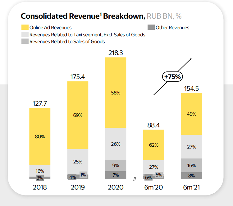 Как и в первом квартале, доля рекламных доходов в общей выручкеостаетсяниже отметки в 50% за счет курса «Яндекса» на диверсификацию бизнеса.