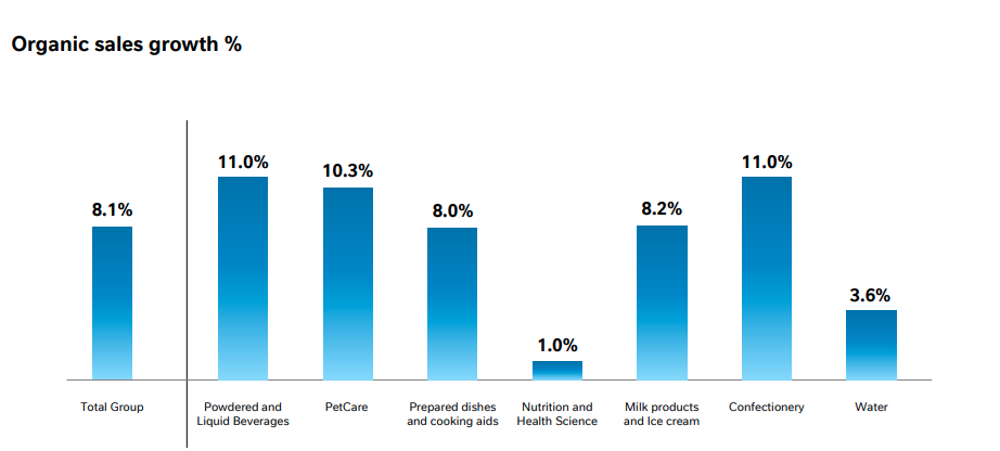 Двузначные темпы роста показали Starbucks (16,7%) и Nespresso (+14,6%),направление Purina PetCare, которое выпускает корма для животных под торговымимарками Purina Pro Plan, Purina ONE и Felix, кондитерский бизнес, продукты длявеганов и подразделение Nestlé Health Science. Категория «Воды» вернулась кросту благодаря глобальным премиальным брендам S.Pellegrino и Perrier. Детскоепитание, напротив, показало падение продаж из-за снижения рождаемости на фонепандемии.