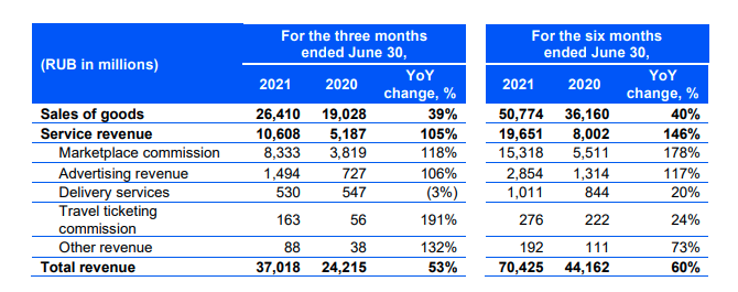Ozon завершил второй квартал ростом выручки на 53%, до 37 млрд руб.Драйверами стали продажи товаров на маркетплейсе (+39%) и сервисная выручка(+105%). Внутри сервисной выручки основными источниками доходов являютсякомиссии продавцов (8,3 млрд руб.), чей объем увеличился на 118%, и реклама(почти 1,5 млрд руб., +106%).