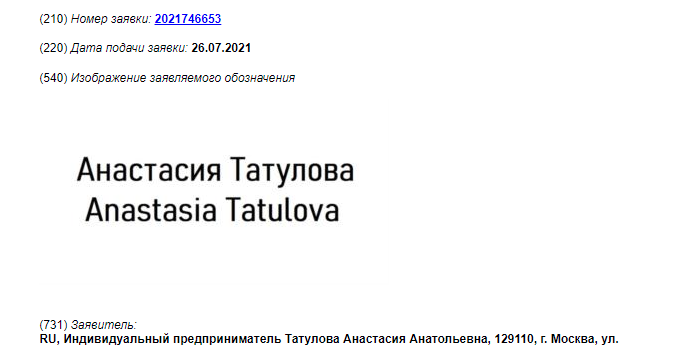 Общественный омбудсмен в сфере малого и среднего предпринимательства,основательница сети семейных кафе «АндерСон» Анастасия Татуловаподала заявку на регистрацию личного бренда. Она хочетзастолбить свое имя на кириллице и латинице. Сейчас заявка проходит формальнуюэкспертизу в Роспатенте.